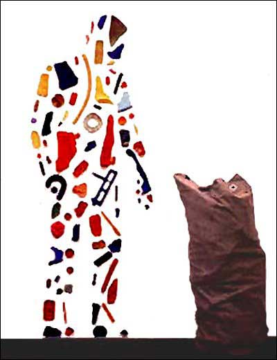 • 28 Tony Cragg, Selbstbildnis mit Sack, aus angespülten Plastikteilen, die er eingesammelt und zu einer Gestalt zusammen gesetzt hat an der Seite eines Seesacks. Die Materialien sind vom Menschen hergestellt oder zumindest bearbeitet und sind damit  Bestandteile der heutigen Zivilisation.