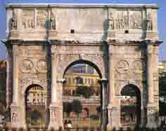 • 01 Konstantinsbogen Rom, 312/315. Der Ehrenbogen, 312 begonnen, vollendet 315 zur Feier des 10. Regierungsjubiläums Konstantins. Die Reliefs beziehen sich auf das Leben Konstantins (Wildschweinjagd). Werke aus Bauten Marc Aurels wurden verwendet, um die Reliefs zu schaffen. Die Physiognomie des Jägers wurde abgeschlagen und statt  dessen mit einem Kopf Konstantins ergänzt. Der Austausch des Portraits ist Ausdruck der Macht Konstantins.